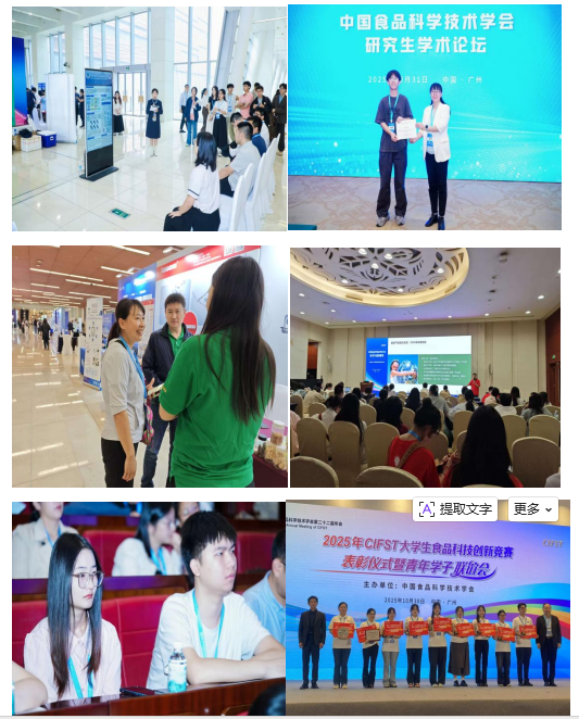 2025年10月29日-10月31日,中国食品科学技术学会(CIFST)第二十二届年会在广州隆重召开。本届年会由8家高校及科研院所共同承办,汇聚了孙宝国、朱蓓薇等多位工程院院士,以及近2000位食品领域的专家学者与青年学生,以多形式搭建跨界融合平台,推动产学研用一体化发展,为食品工业“十五五”新征程注入科技动能。365电子娱乐官方网站师生携创新成果参会,与业界精英进行了深入的交流与学习,为自身的学术研究和未来发展汲取了宝贵经验。在学术交流中拓宽视野,在竞赛舞台上斩获佳绩,充分展现了学院的学科实力与人才培养成效。